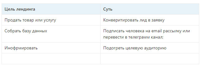 Целей при самостоятельном создании лендинга может быть несколько. Продать — конвертировать лид в заявку; собрать базу данных — подписать человека на email рассылку или перевести в телеграм канал; информировать — подогреть аудиторию.